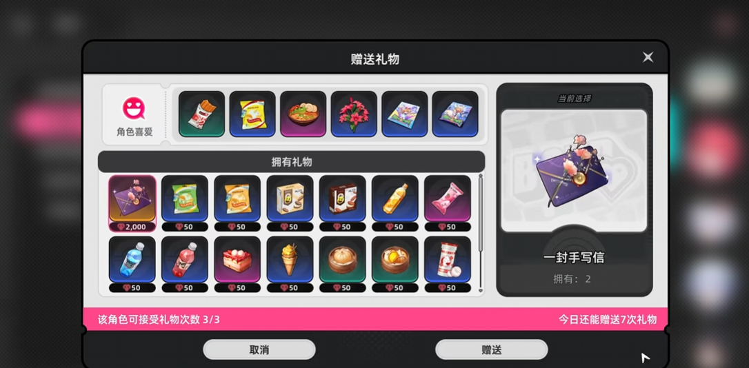操作路径:角色图鉴 → 点击头像 → 右下“礼物”图标 → 选礼物一键赠送
