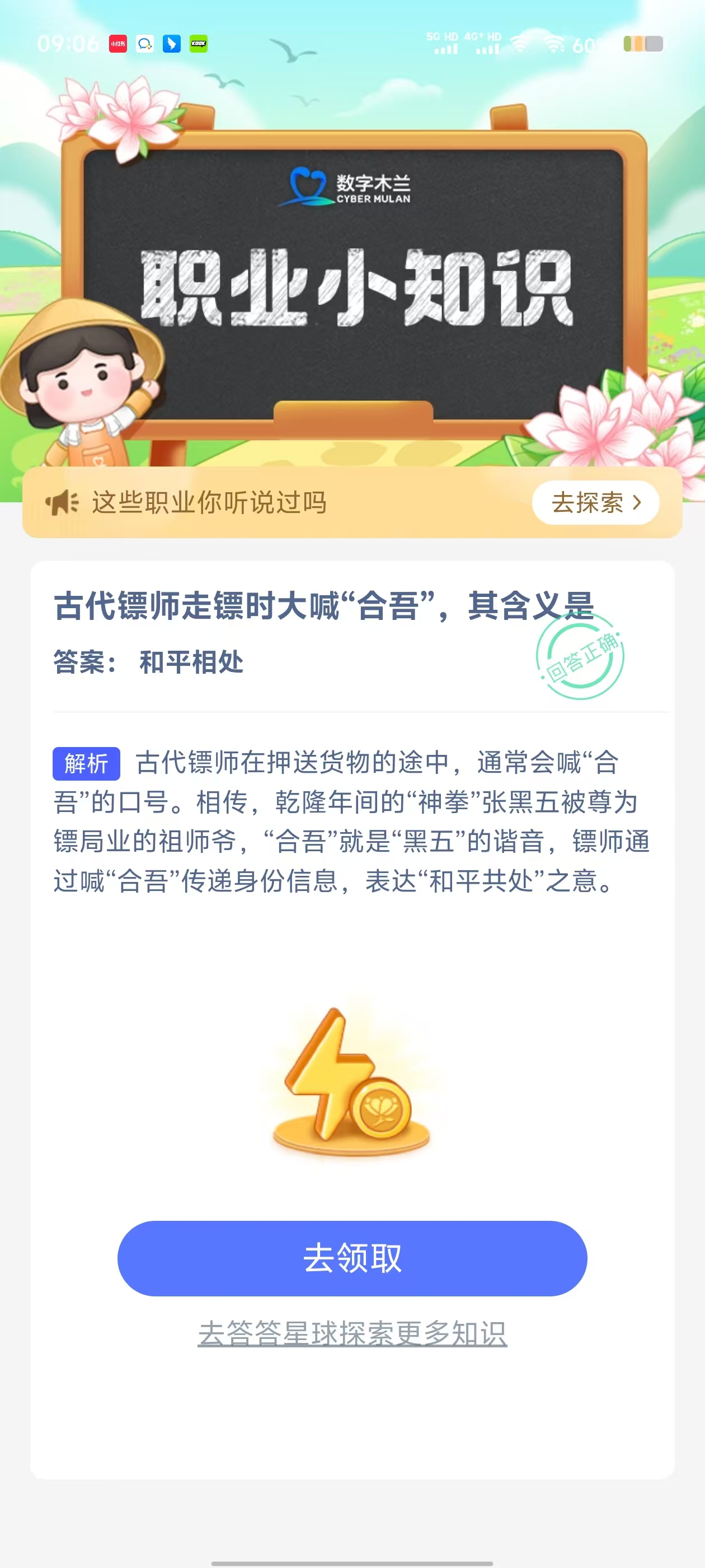 2、在【职业小知识问答】对话框中,点击【去完成】进入答题页面;