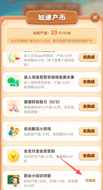 3、选择正确答案,答对可得“产速+3/时”,答错也有“产速+1/时”,奖励有效期为24小时;