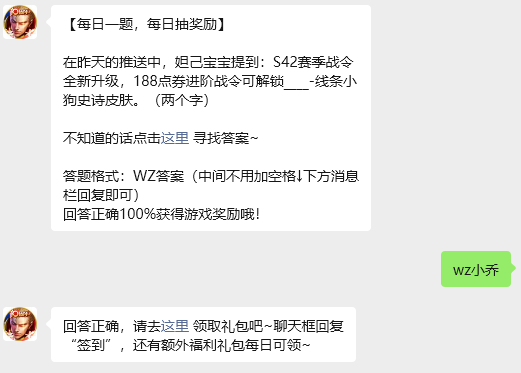今日问题:在昨天的推送中,妲己宝宝提到:S42赛季战令全新升级,188点券进阶战令可解锁____-线条小狗史诗皮肤。(两个字)