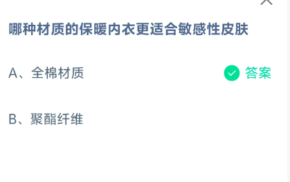 哪种材质的保暖内衣更适合敏感性皮肤?这是今天《支付宝》每日一题的问题,相信我们很多用户都很想知道这个问题的答案是什么?这么一个可以领取饲料的机会相信我们很多用户都不想错过,这里指玩手游网的小编为你带来了2026《支付宝》1月14日每日一题最新答案介绍(1)的全部内容,喜欢的小伙伴欢迎点击进入看看吧。