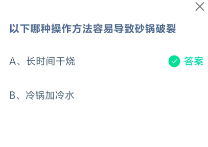 冷锅加冷水(选项B):虽然骤冷骤热也会损伤砂锅,但题目强调的是“容易导致破裂”的典型操作,长时间干烧是最常见的错误做法。