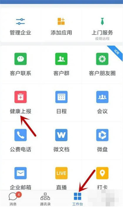 1、打开企业微信 → 点击 工作台 → 找到 健康上报。