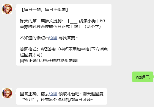 今日问题:昨天的第一篇推文提到:「____-线条小狗」60点券限时秒杀皮肤今日正式上线!(两个字)