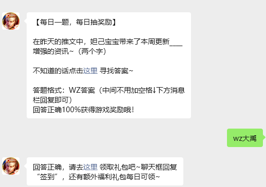 今日问题:在昨天的推文中,妲己宝宝带来了本周更新____增强的资讯~(两个字)