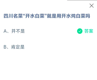 四川名菜"开水白菜"就是用开水炖白菜吗?这是今天《支付宝》每日一题的问题,相信我们很多用户都很想知道这个问题的答案是什么?这么一个可以领取饲料的机会相信我们很多用户都不想错过,这里指玩手游网的小编为你带来了2026《支付宝》1月17日每日一题最新答案介绍(2)的全部内容,喜欢的小伙伴欢迎点击进入看看吧。