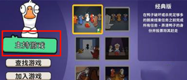 进入鹅鸭杀游戏,在创建房间的页面选择 “主持游戏”。