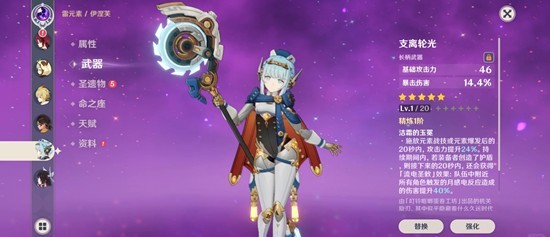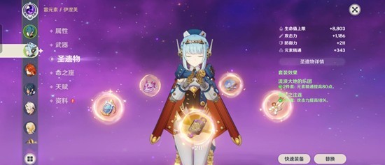 纺月套:适合辅助月感电队,提供充能、精通加成以及月感电反应增伤,效果加成完美契合。