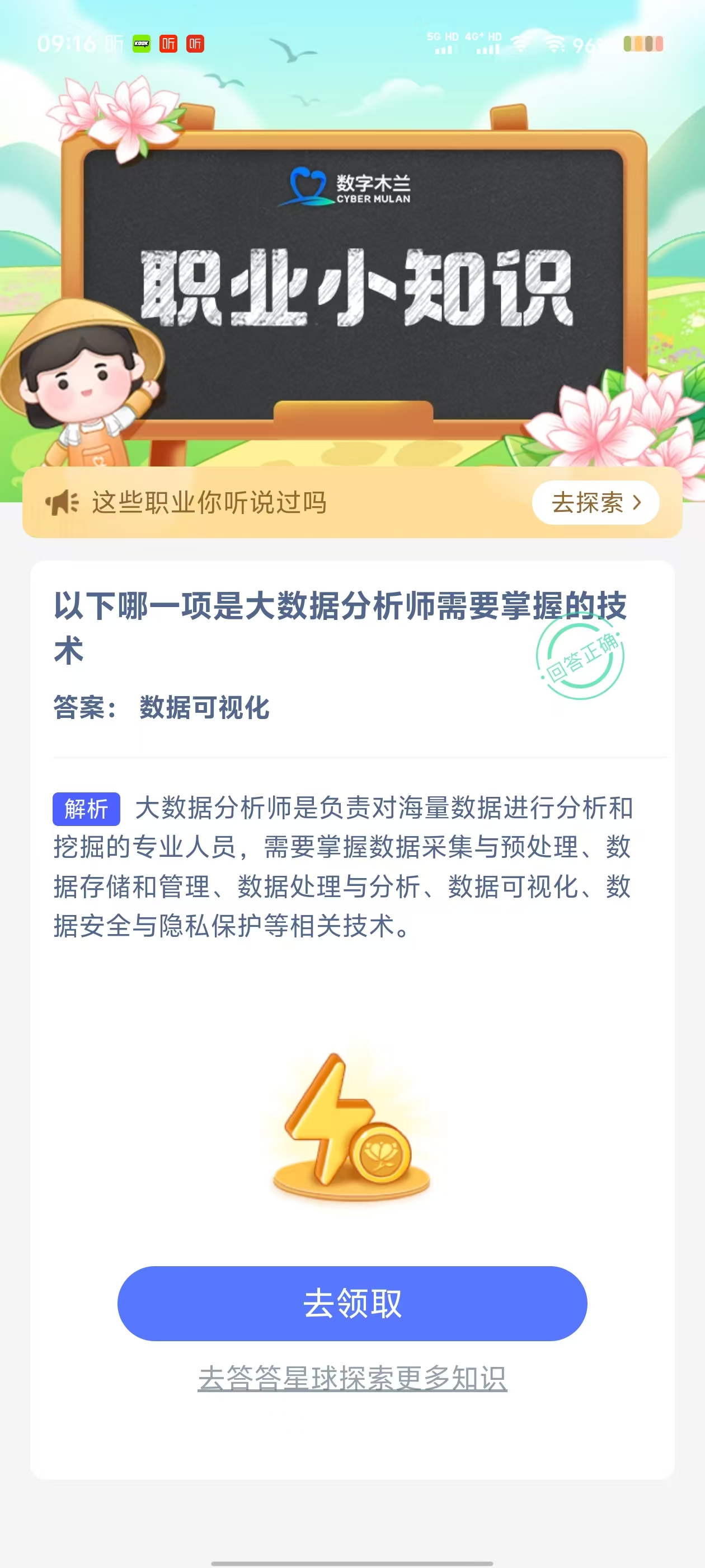 2、在【职业小知识问答】对话框中,点击【去完成】进入答题页面;