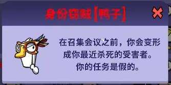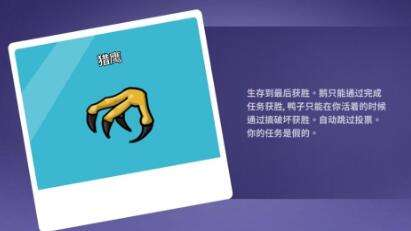 获胜条件:通过完成任务且保持自身存活,或者成功消灭鸭子阵营的成员即可取得胜利。