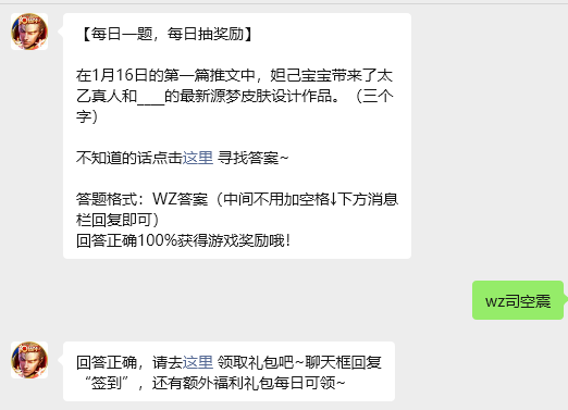 今日问题:在1月16日的第一篇推文中,妲己宝宝带来了太乙真人和____的最新源梦皮肤设计作品。(三个字)