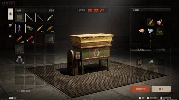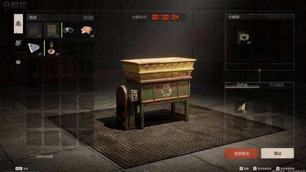 将布料和针线包带回安全区,放入 分解机分解(等待分解完成,可同时处理其他物资)。