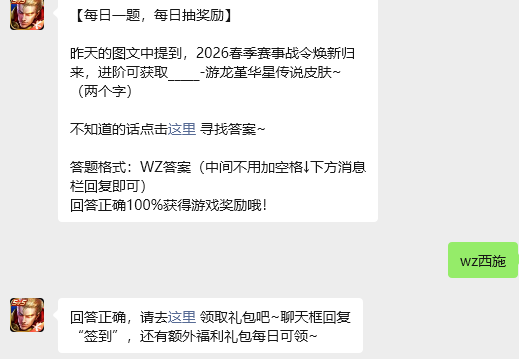 今日问题:昨天的图文中提到,2026春季赛事战令焕新归来,进阶可获取_____-游龙堇华星传说皮肤~(两个字)