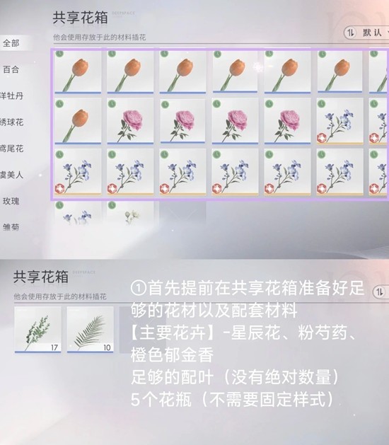 图上三种为主要花材,数量不限,但缺少会导致星星不插花