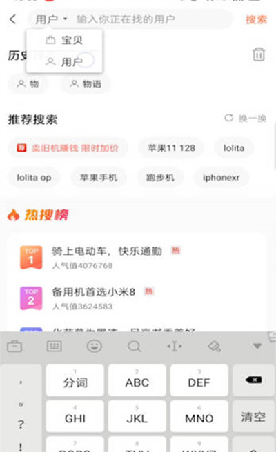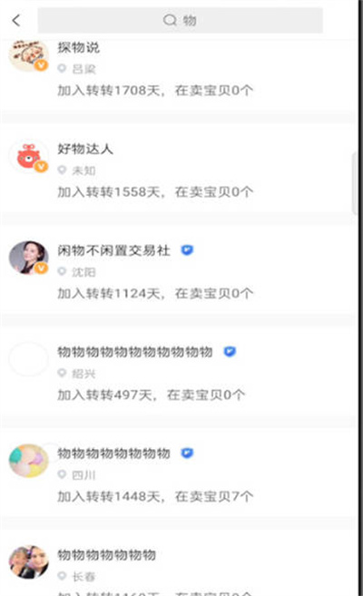 打开转转 → 点击上方 搜索框 → 左侧选择 宝贝 → 切换到 用户