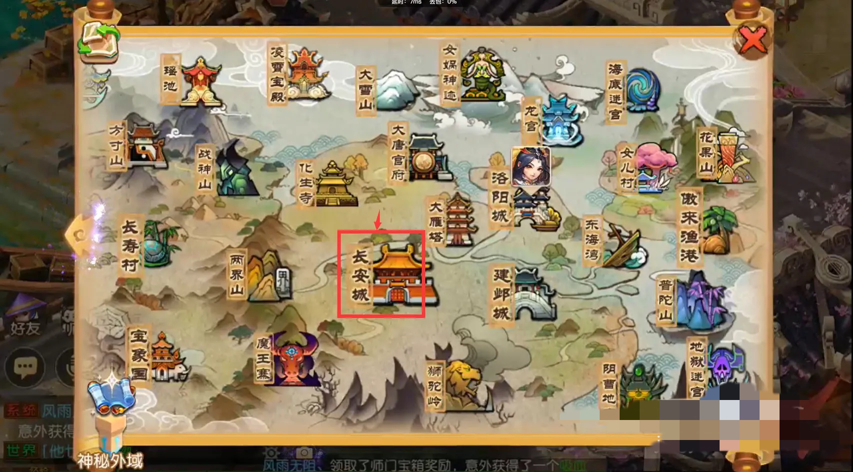 1、打开长安地图:点击世界地图 → 长安城 → 左上角区域小地图。
