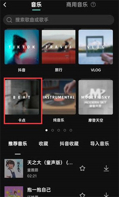在音乐页面点击【卡点】,选择合适的音乐卡点。