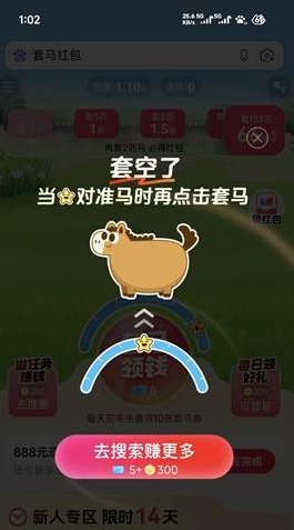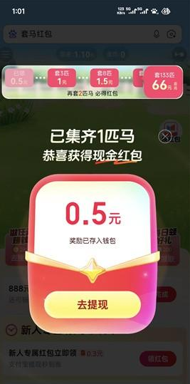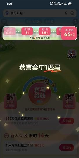3、点击“套马领钱”,套中马即可获得红包奖励。