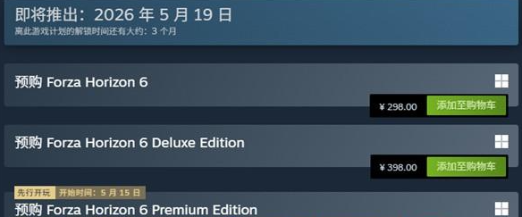 标准版:售价298元,2026年5月19日解锁,包含游戏本体和欢迎包(5辆预调校赛车、1张车辆兑换券、3张服饰兑换券)。