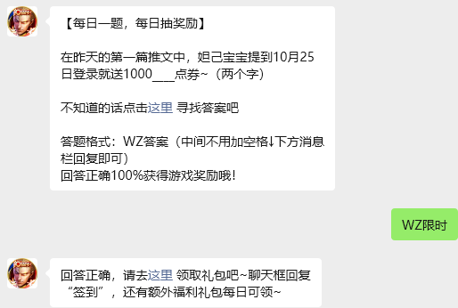 今日问题:在昨天的第一篇推文中,妲己宝宝提到10月25日登录就送1000____点券(两个字)