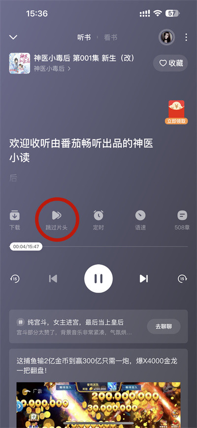2、小说播放页面 → 点击 跳过片头(红色圆圈图标)