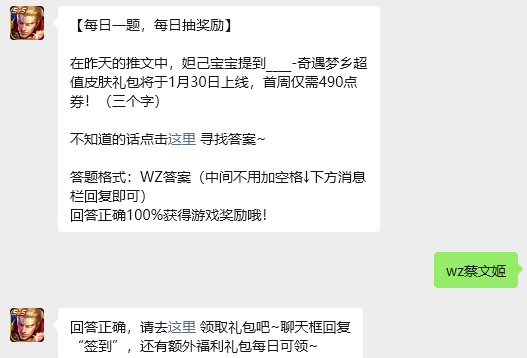 今日问题:在昨天的推文中,妲己宝宝提到____-奇遇梦乡超值皮肤礼包将于1月30日上线,首周仅需490点券!(三个字)