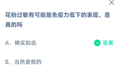 花粉过敏有可能是免疫力低下的表现,是真的吗?这是今天《支付宝》每日一题的问题,相信我们很多用户都很想知道这个问题的答案是什么?这么一个可以领取饲料的机会相信我们很多用户都不想错过,这里指玩手游网的小编为你带来了2026《支付宝》1月30日每日一题最新答案介绍(1)的全部内容,喜欢的小伙伴欢迎点击进入看看吧。