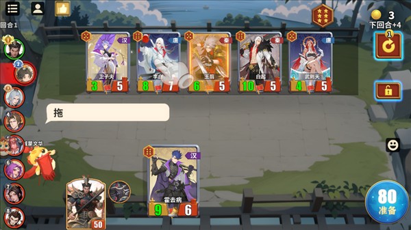 回合内操作:每回合结束可招募卡牌,三个相同卡牌可升星,右侧可刷新。