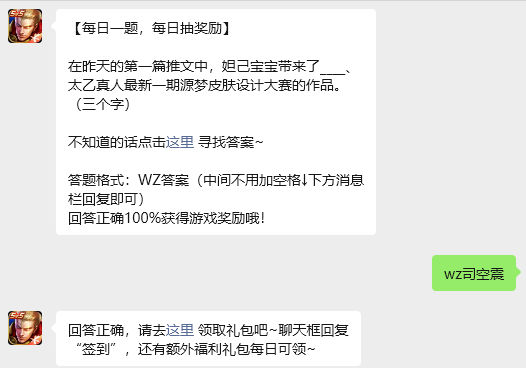 今日问题:在昨天的第一篇推文中,妲己宝宝带来了____、太乙真人最新一期源梦皮肤设计大赛的作品。(三个字)