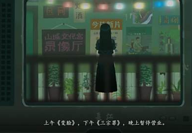 5、邱芜进入录像厅后,注意到放映室门后伸出了一只手,得知需要门票才能进入放映室。于是,她从大厅中间的售票窗口获得了门票。