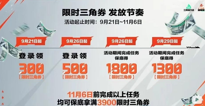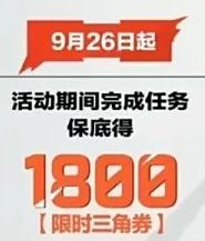 9月26日起:活动期间完成指定任务,保底获得1800张三角券
