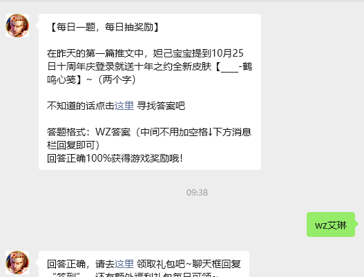 今日问题:在昨天的第一篇推文中,妲己宝宝提到10月25日十周年庆登录就送十年之约全新皮肤【____-鹤鸣心笺】~(两个字)