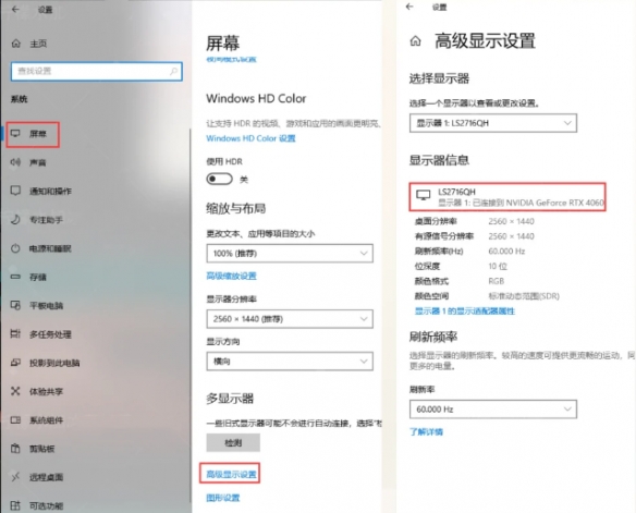2、打开“开始”-“设置”(齿轮图标)-“屏幕”-“高级显示设置”检查显卡连接情况。
