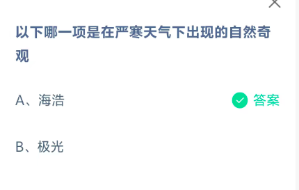 以下哪一项是在严寒天气下出现的自然奇观?这是今天《支付宝》每日一题的问题,相信我们很多用户都很想知道这个问题的答案是什么?这么一个可以领取饲料的机会相信我们很多用户都不想错过,这里指玩手游网的小编为你带来了2026《支付宝》2月12日每日一题最新答案介绍(1)的全部内容,喜欢的小伙伴欢迎点击进入看看吧。