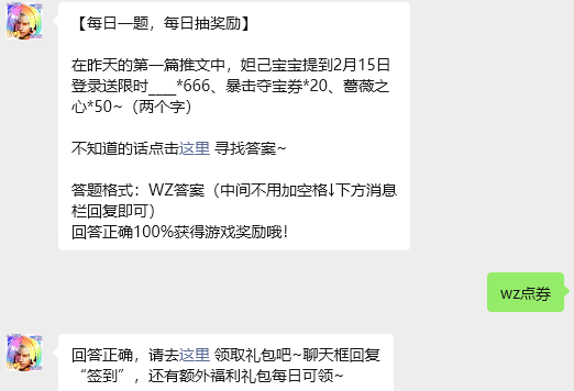 今日问题:在昨天的第一篇推文中,妲己宝宝提到2月15日登录送限时____*666、暴击夺宝券*20、蔷薇之心*50~(两个字)