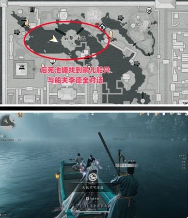 天机不可泄露:在 后苑池塘找到 鹂儿船只,然后与船夫 李德全 对话。