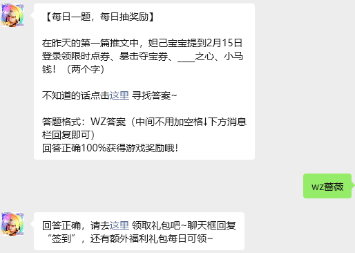 今日问题:在昨天的第一篇推文中,妲己宝宝提到2月15日登录领限时点券、暴击夺宝券、____之心、小马钱!(两个字)