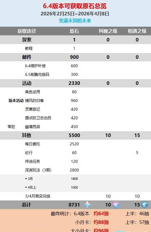 零氪玩家能获得8731原石、10个纠缠之缘、15个相遇之缘
