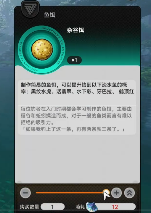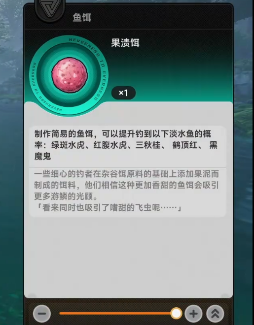 特点是通用——淡水、海水都能用,不用针对钓点选择。制作中加入复合饵料成分,对多种鱼类都有吸引力,但没有额外加成,钓稀有鱼的概率不会提升。适合钓鱼入门玩家,一种饵料就能应付所有场景,但对高级玩家来说性价比有限。
