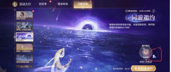 4、打开同游邀约界面并填写邀请码,只需填写邀请码即可,记得删除口令文字(此步骤在更换素材之前的任何时间都可以完成)(图片为大号绑定好的页面,如与自己不同请自行检查)。