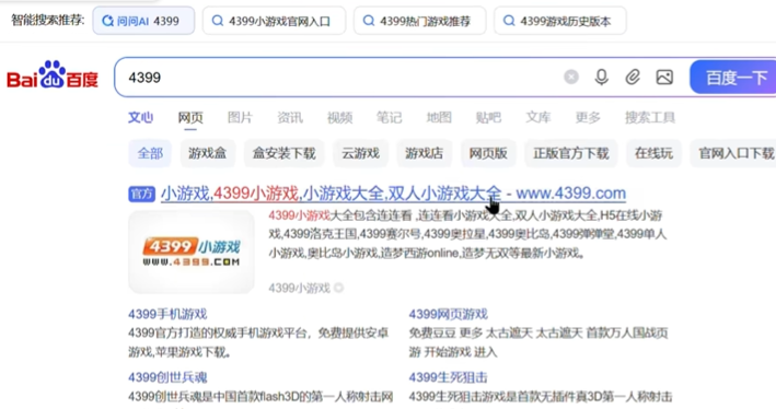 1、首先,我们进入浏览器,然后搜索4399进入官网。