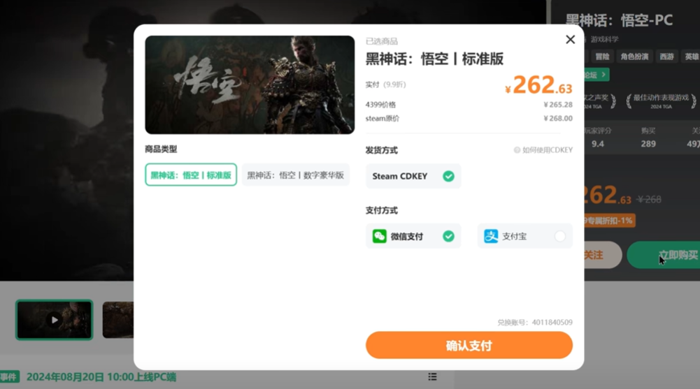 3、进入【黑神话悟空】的购买界面,点击立即购买。