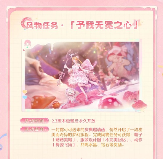 露可可送来的庆典邀请函开启梦幻旅程。完成任务可得:帽子「菇菇美帽」、设计图「不完美回忆」、动作【舞姿飞扬】、共鸣水晶、钻石等奖励。
