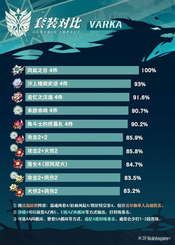 ③ 若另一位双风队友没选风套(如风起4温迪、勇者4伊法),那么本就能自主触发扩散的法尔伽也完全可以用【风套4】来减抗、提高占比更高的染色伤害。