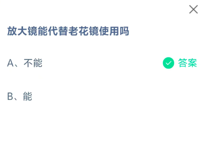 结论:放大镜只能辅助看小物件,不能替代老花镜矫正视力,因此答案是 不能(A)。