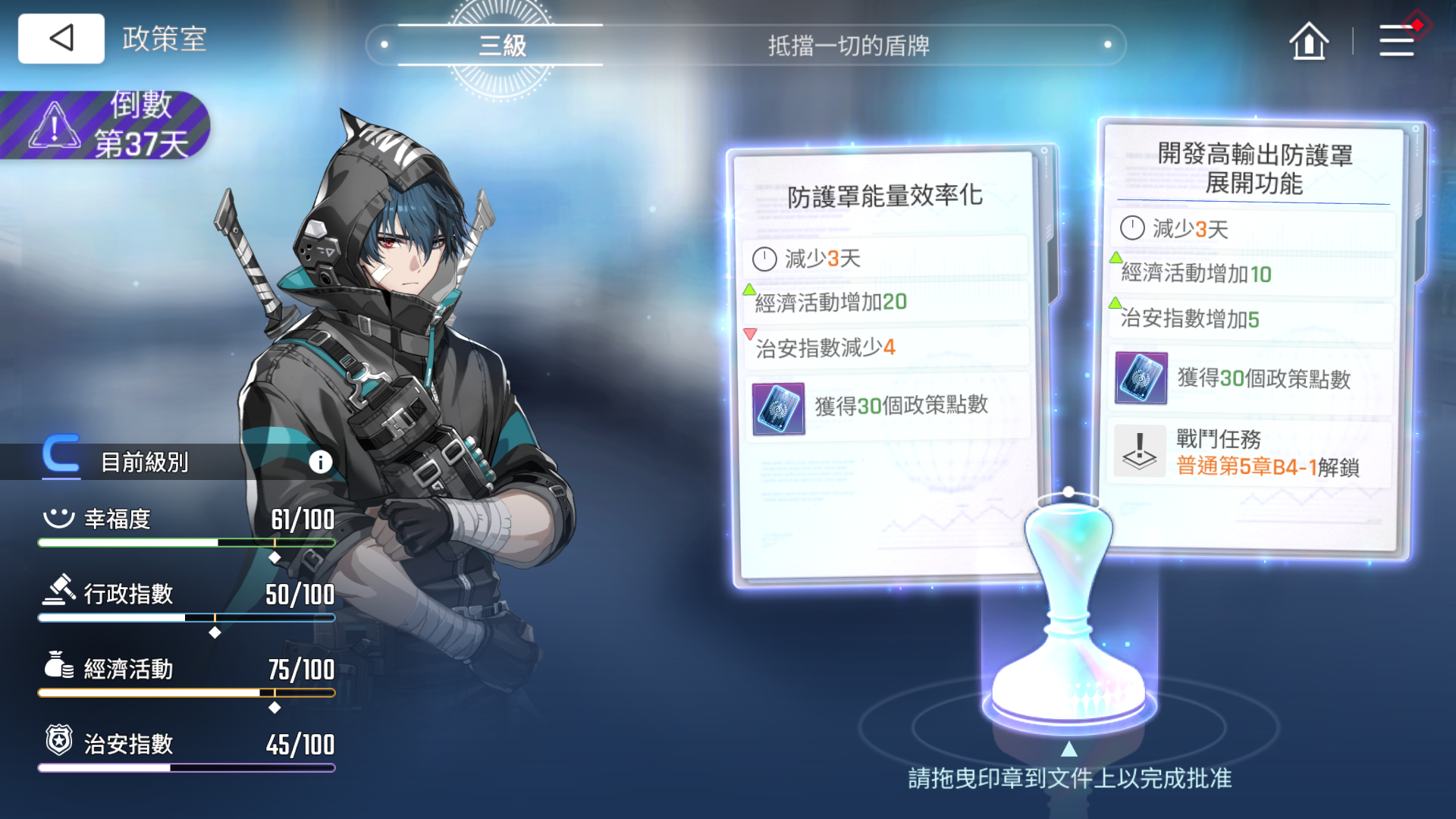 政策选择会缩短灾难倒计时,因此要在时间内完成目标。通常优先选择提升三项指数的政策,但若有机会解锁战斗关卡或研究笔记,也可优先考虑。