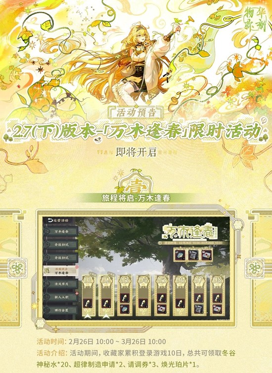 《物华弥新》2.7的下版本活动马上就要开启了,很多玩家想知道这一次的活动到底怎么样呢?万木逢春3月5日正式开启了,那么具体活动怎么样呢?现在就让指玩手游网的小编为大家带来关于《物华弥新》万木逢春3月5日正式开启的全部内容吧,感兴趣的小伙伴一定不要错过哦。