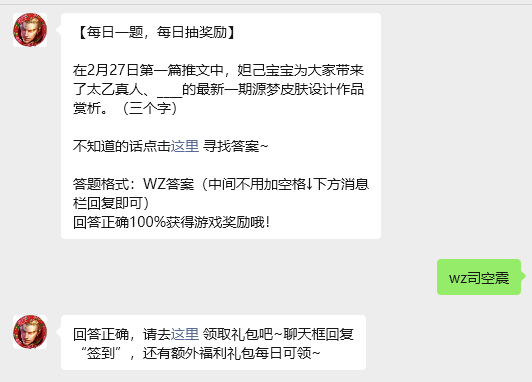 在2月27日第一篇推文中,妲己宝宝为大家带来了太乙真人、____的最新一期源梦皮肤设计作品赏析。(三个字)
