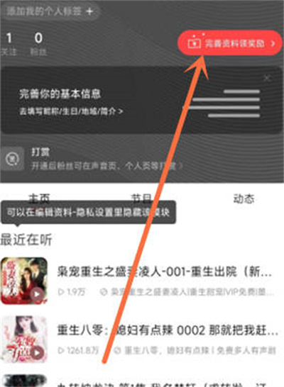 2、完善资料:在个人页,点右侧 完善资料。