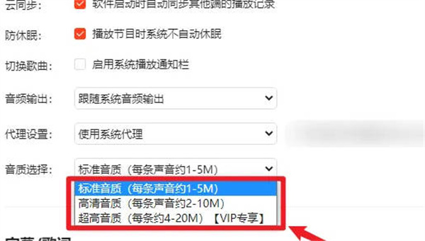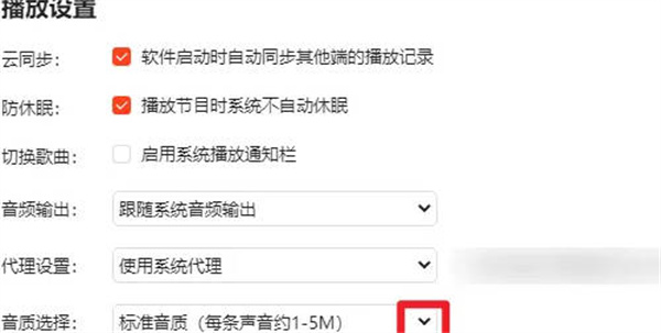 2、找到音质选择:在 播放设置 中,点 音质选择 旁的小箭头。